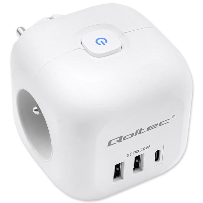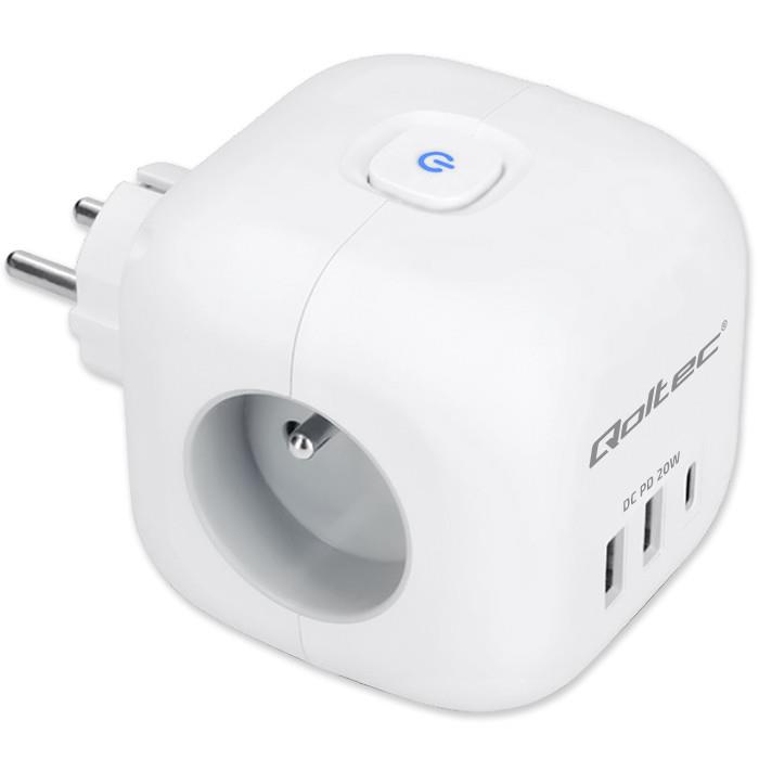 Kostka zasilająca Qoltec przedłużacz 6w1 z podświetlanym włącznikiem | 3x AC | 2x USB | 1x USB-C PD 20W | Biała