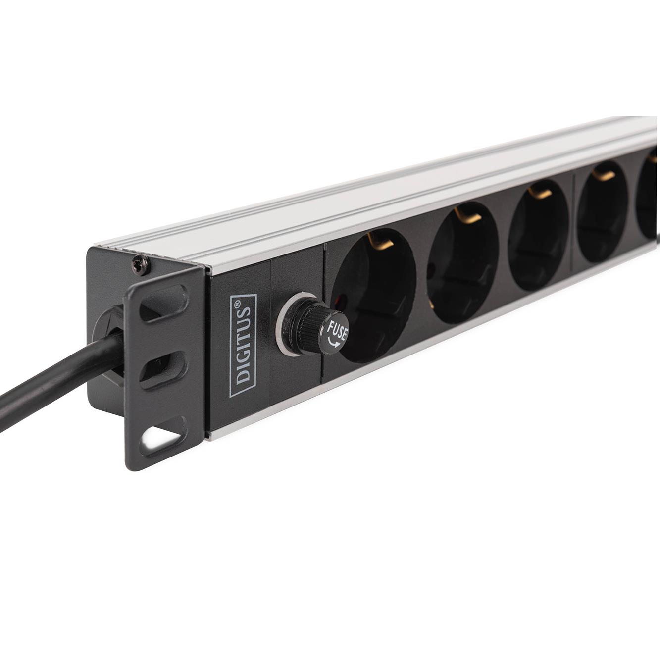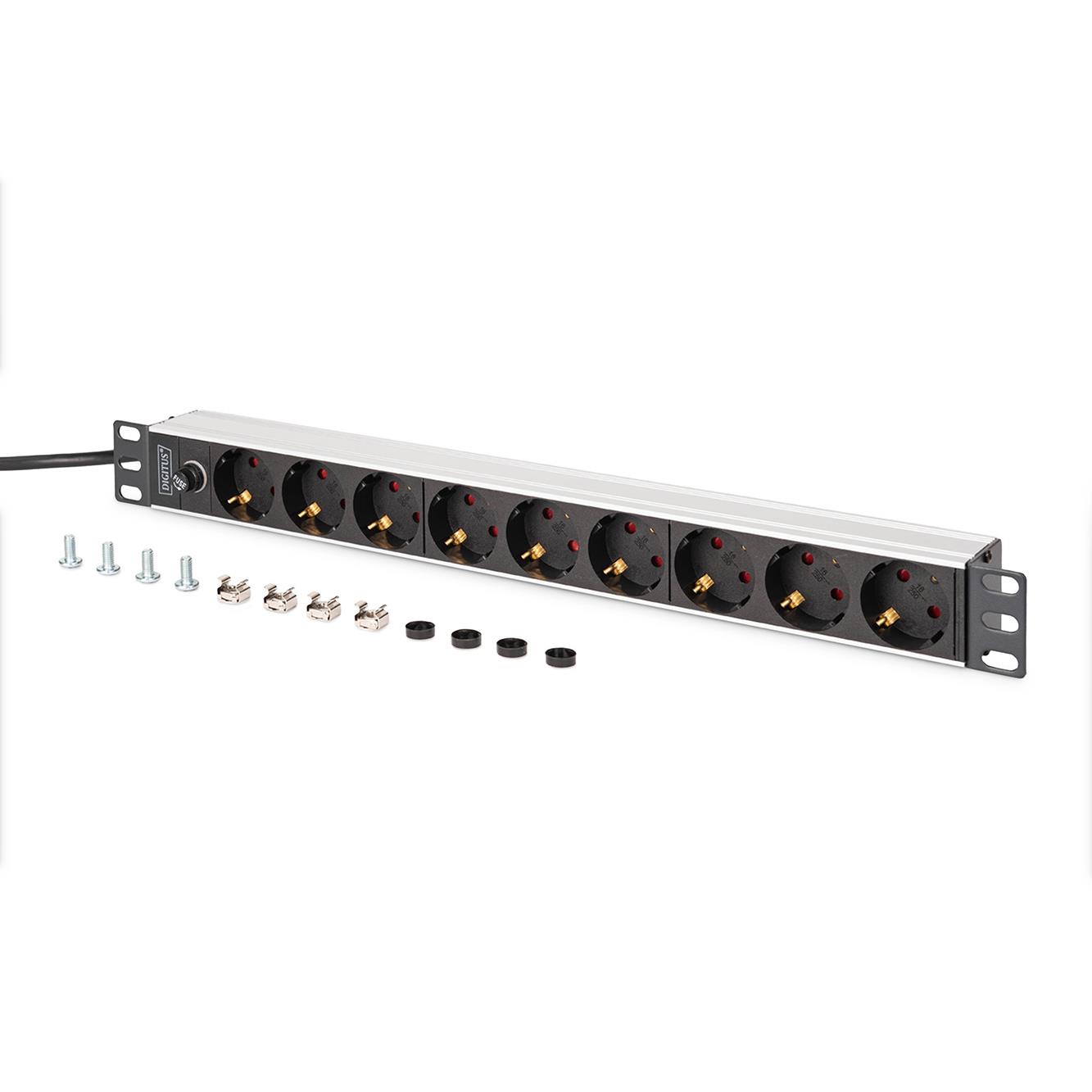 Listwa zasilająca DIGITUS PDU Rack 19" z bezpiecznikiem przeciążeniowym, 9 gniazd Schuko CEE 7/3 (45°), kabel 2m wtyk IEC C14, 10A, aluminiowa