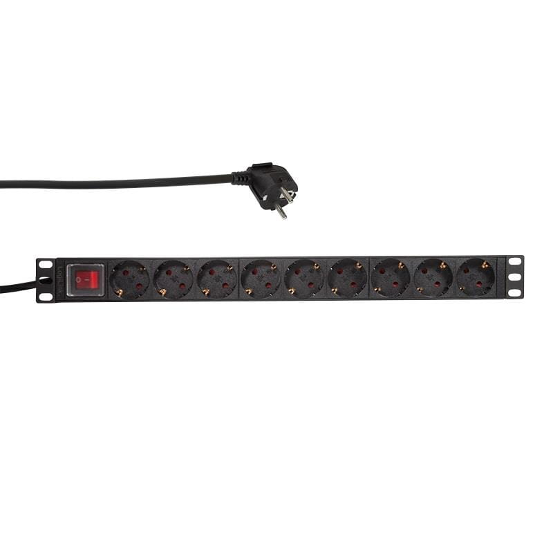 16A, max. 3500W, 19” PDU z włącznikiem/wyłącznikiem, Gniazda: 9 x DIN 49440, zgodne z VDE0620-1, Kolor: RAL 9005 Czarny, Profil: powłoka ze stopu aluminium, Przewód zasilający 2m H05VV-F 3x 1,5 mm2 z wtyczką CEE7/7, Wymiary: 1U, 482 x 45 x 45mm, Z włącznikiem / wyłącznikiem