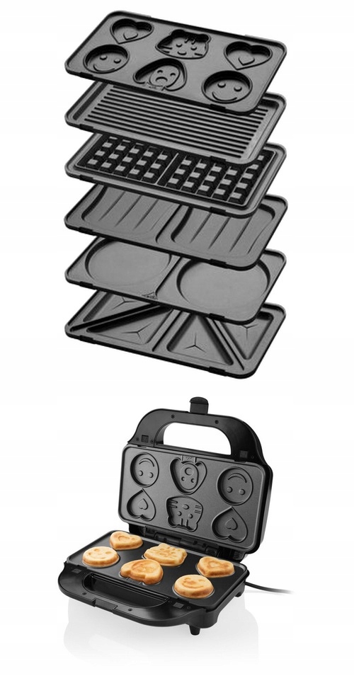 Opiekacz z 6 rodzajami wymiennych płyt do przygotowania tostów, gofrów, panini, dań z grilla, a także naleśników i ciast dla dzieci.