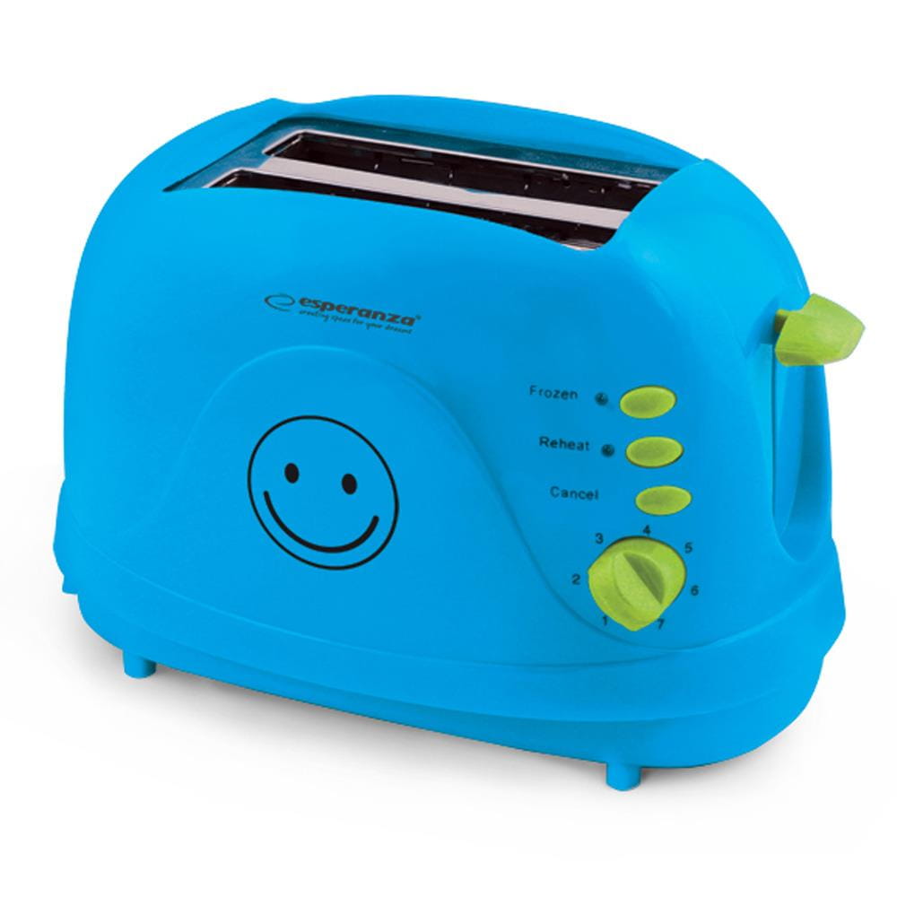 7 stopni ustawień intensywności opiekania., Automatyczne wysuwanie pieczywa i wyłączanie po zakończeniu opiekania., Dwie grafiki wypieku: 'uśmiech' oraz 'słoneczko'., Funkcja natychmiastowego przerwania pracy przed końcem ustawionego czasu., Miejsce na przechowywanie kabla sieciowego., Napięcie i częstotliwość: 220-240 V, 50 Hz, Nóżki antypoślizgowe., Opiekanie pieczywa, rozmrażanie mrożonego pieczywa, ponowne podgrzewanie., Przeznaczony do przygotowania grubych i cienkich tostów., Timer elektroniczny., Toster dzięki dwóm różnym grafikom zaprojektowanym specjalnie dla dzieci., Twoje pociechy będą mogły czerpać wiele radość ze śniadania., Zewnętrzna obudowa z termoizolacją (chłodna w dotyku podczas pracy)., Łatwe czyszczenie (wysuwana tacka na okruchy).